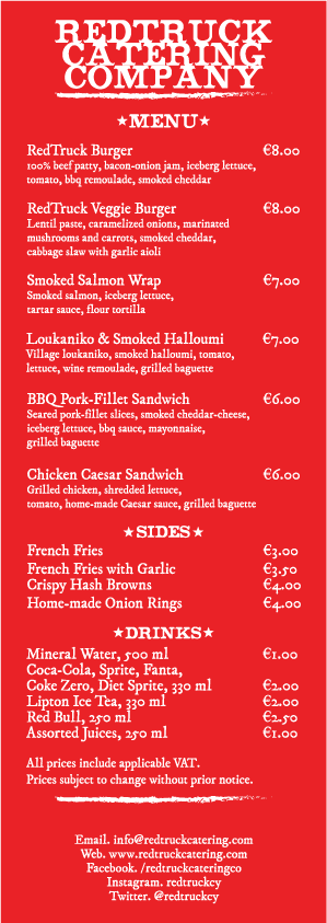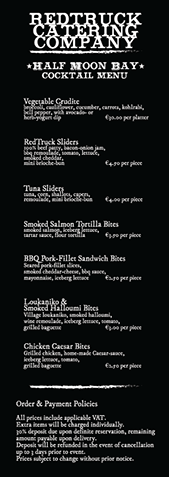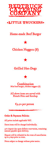 With over twenty years of experience in the hospitality industry throughout Europe, the RedTruck Catering team has the expertise to provide top-flight catering service for the most discerning clients. RedTruck Catering Company offers bespoke solutions for your catering needs, whatever they may be. Click on our catering menus on the right, and save them directly to your computer or smart phone. The red menu is our current selection of speciality deliciousness. The black menu, "Half Moon Bay", is an assortment of amuse-bouche sized treats, perfect for any cocktail party. The white menu, "Little Truckers", is tailored towards our younger guests. Feel free to select any combination of items from all of our menus. We're flexible. For any queries, feel free to contact us at any time. We look forward to working closely with you to make your next event a memorable one.